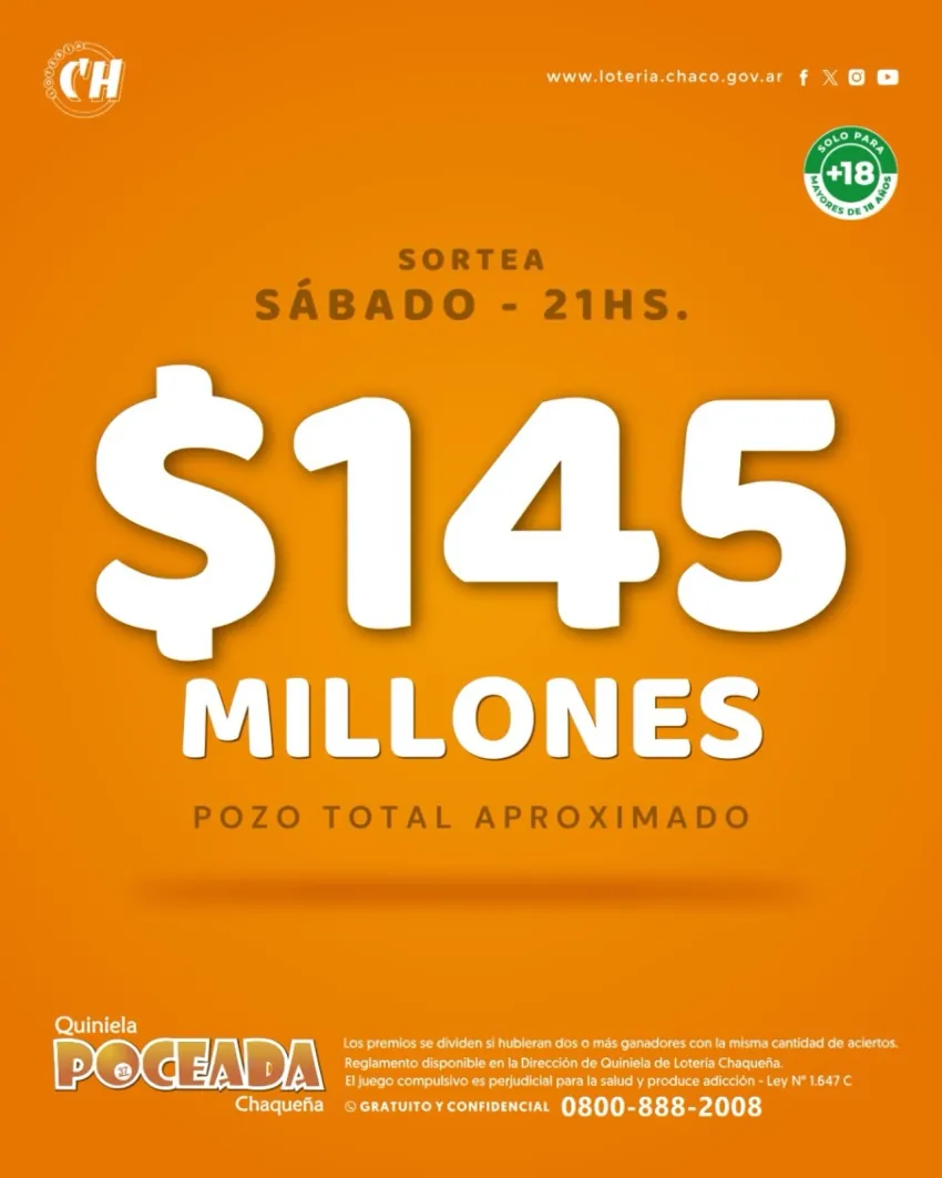 Lotería Chaqueña pone en juego un pozo de al menos 145 millones de pesos en el sorteo de este 5 de abril en la Quiniela Poceada.