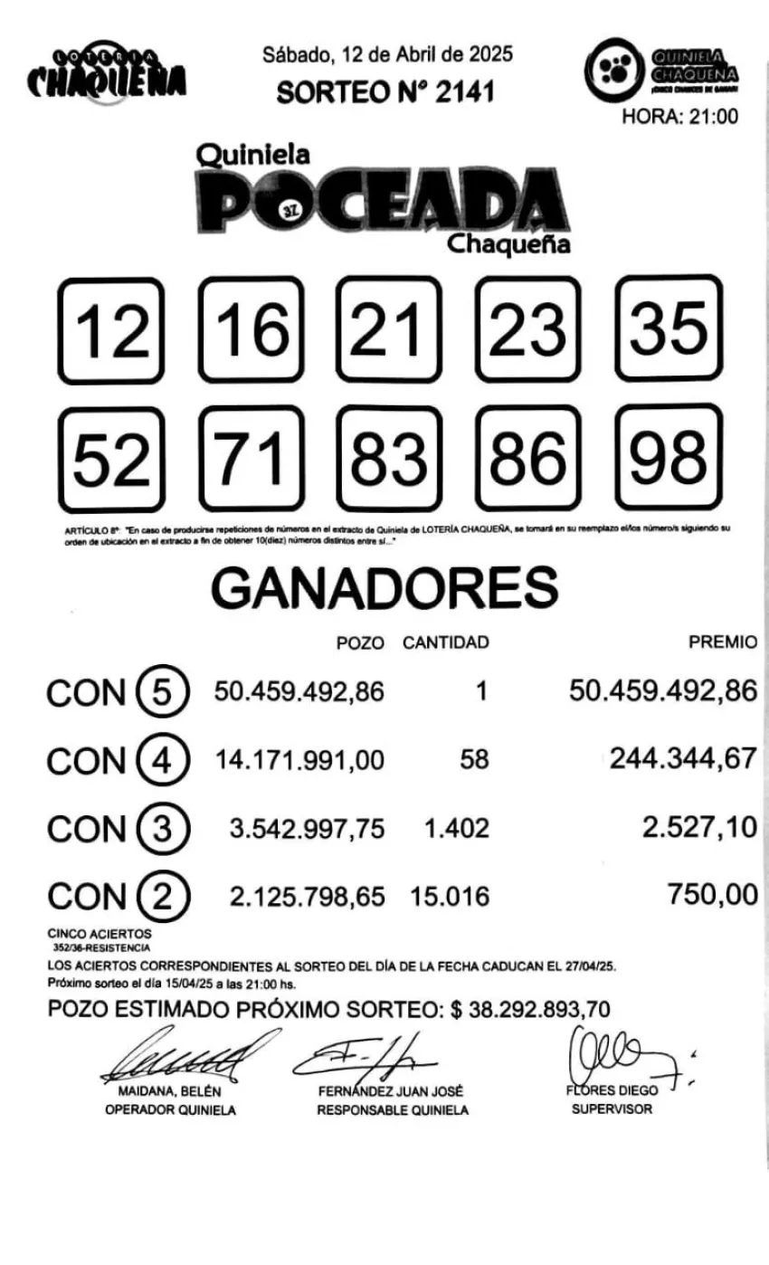 de Lotería Chaqueña arrojó los siguientes números sorteados: 12 - 16 - 21 - 23 – 35 - 52 - 71 - 83 - 86 – 98.