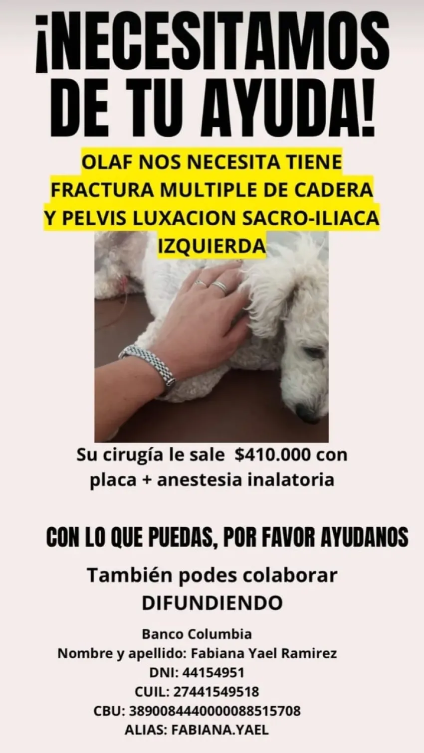 Olaf necesita una cirugía porque tiene una fractura múltiple de cadera y pelvis sacrolaica, la intervención cuesta 410.000 pesos. Por esa razón los dueños piden colaboración a la comunidad con lo que puedan.