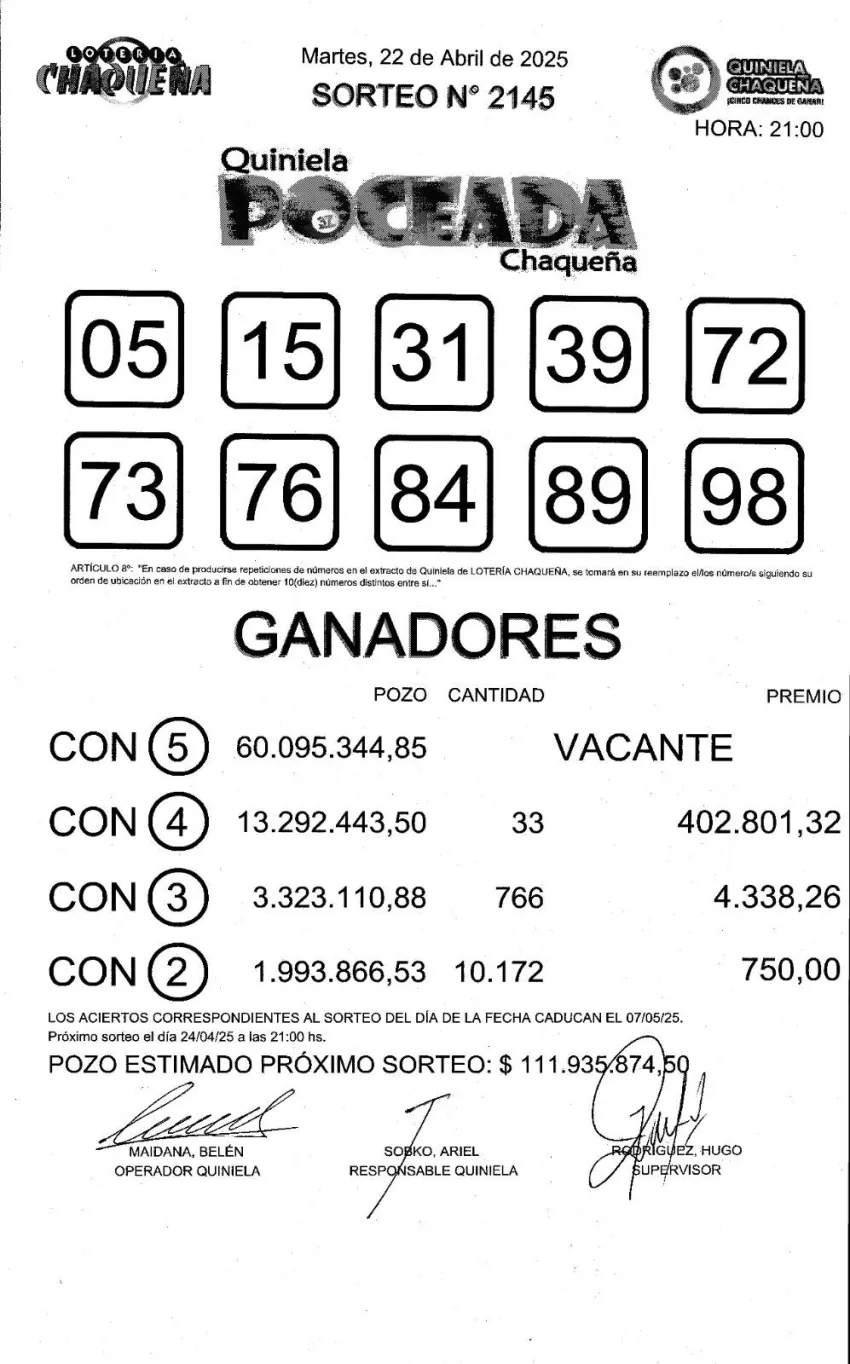 Los números sorteados fueron: 05-15-31-39-72-73-76-84-89 y 98. Con cuatro aciertos, hubo 33 ganadores que se llevarán 402.000 pesos cada uno. El próximo jueves el pozo tendrá un piso de premio de 111 millones de pesos.