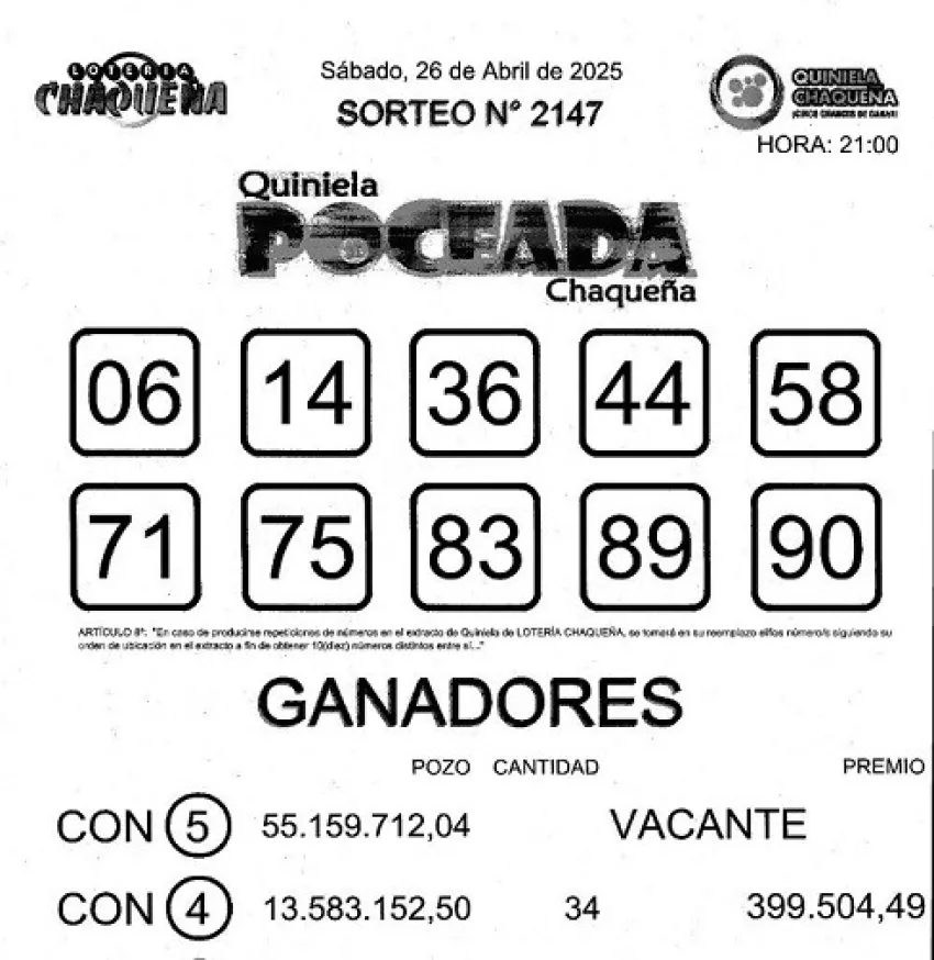 El sorteo n° 2147 de Lotería Chaqueña, para la Quiniela Poceada Chaqueña del sábado 26 de abril arrojó los siguientes números: 06 - 14 - 36 - 44 - 58 - 71 - 75 - 83 - 89 - 90.