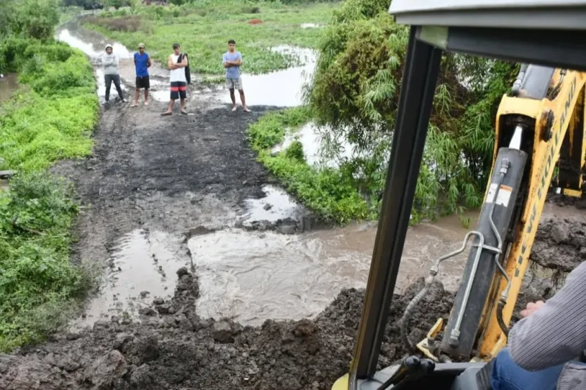 Municipalidad de Machagai: trabajos con máquinas para que escurra el agua de lluvias