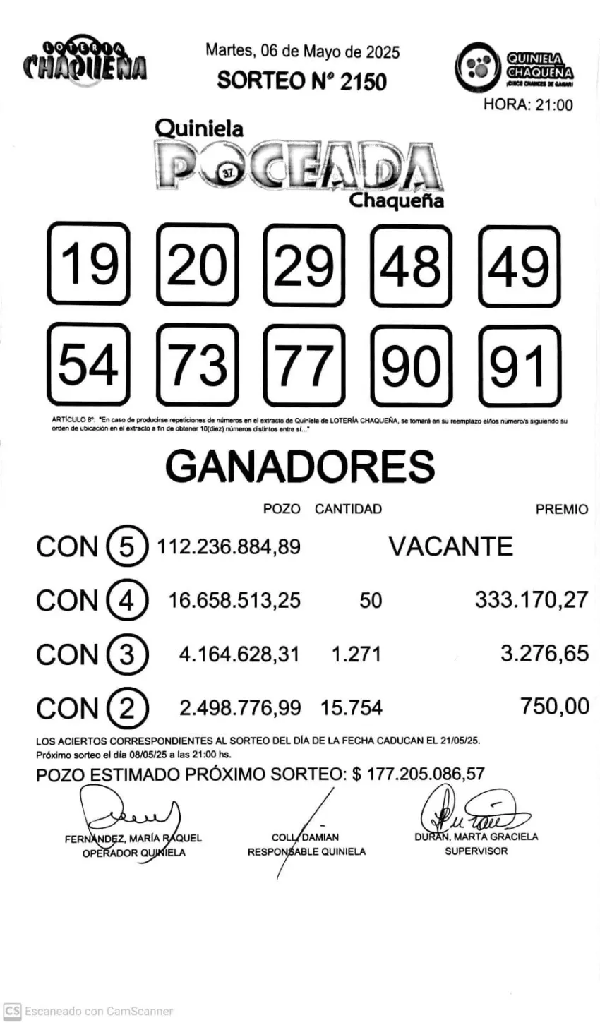 Se efectuó este martes un nuevo sorteo de la Quiniela Poceada de Lotería Chaqueña y no hubo ganadores con los cinco aciertos.
