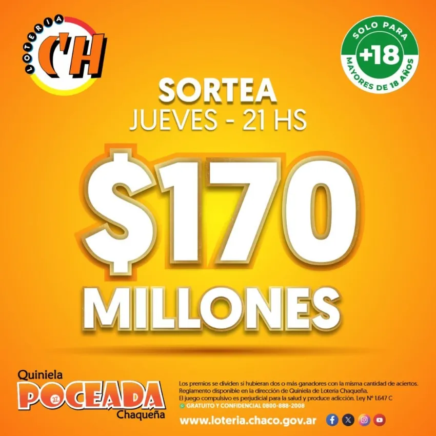 La Quiniela Poceada de Lotería Chaqueña sortea este jueves 8 de mayo un primer premio con un pozo aproximado de 170 millones de pesos.