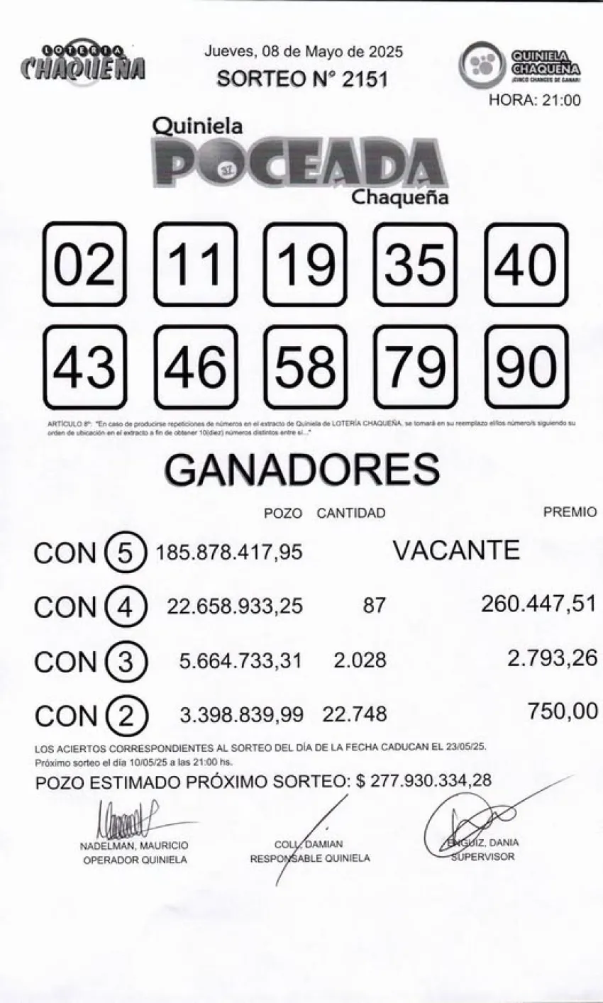 Se efectuó este jueves un nuevo sorteo de la Quiniela Poceada de Lotería Chaqueña y no hubo ganadores con los cinco aciertos.