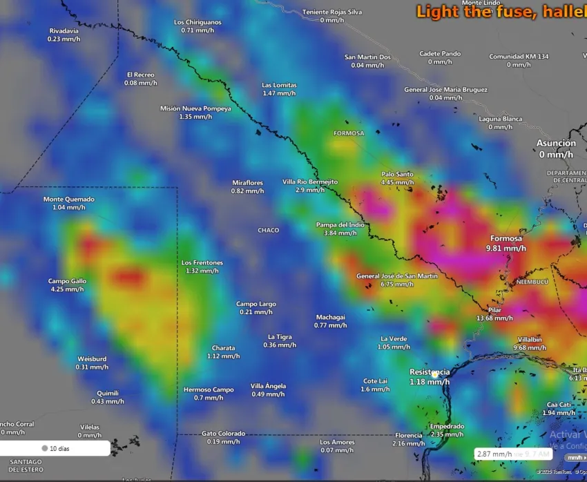 Mientras la región metropolitana enfrentaba aguaceros intensos, el interior presentó escenarios contrastantes. Napenay y Presidencia de la Plaza apenas alcanzaron 9 mm. Algo similar ocurrió en Campo Largo y Coronel del Bermejo, que registraron 15 mm.