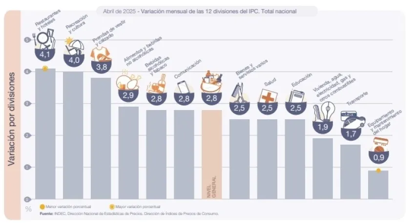 Las dos divisiones que registraron las menores variaciones en abril de 2025 fueron Transporte (1,7%) y Equipamiento y mantenimiento del hogar (0,9%).