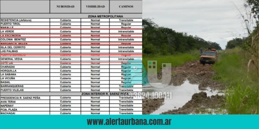 En la Zona Metropolitana, los accesos a La Verde, Colonia Benítez, Isla del Cerrito, Las Palmas y General Vedia presentan serias dificultades para el tránsito. A esto se suman Enrique Urien y Samuhú, en la zona de Villa Ángela, y cuatro localidades de la Zona General San Martín: Pampa Almirón, Capitán Solari, Laguna Limpia y Selvas del Río de Oro.