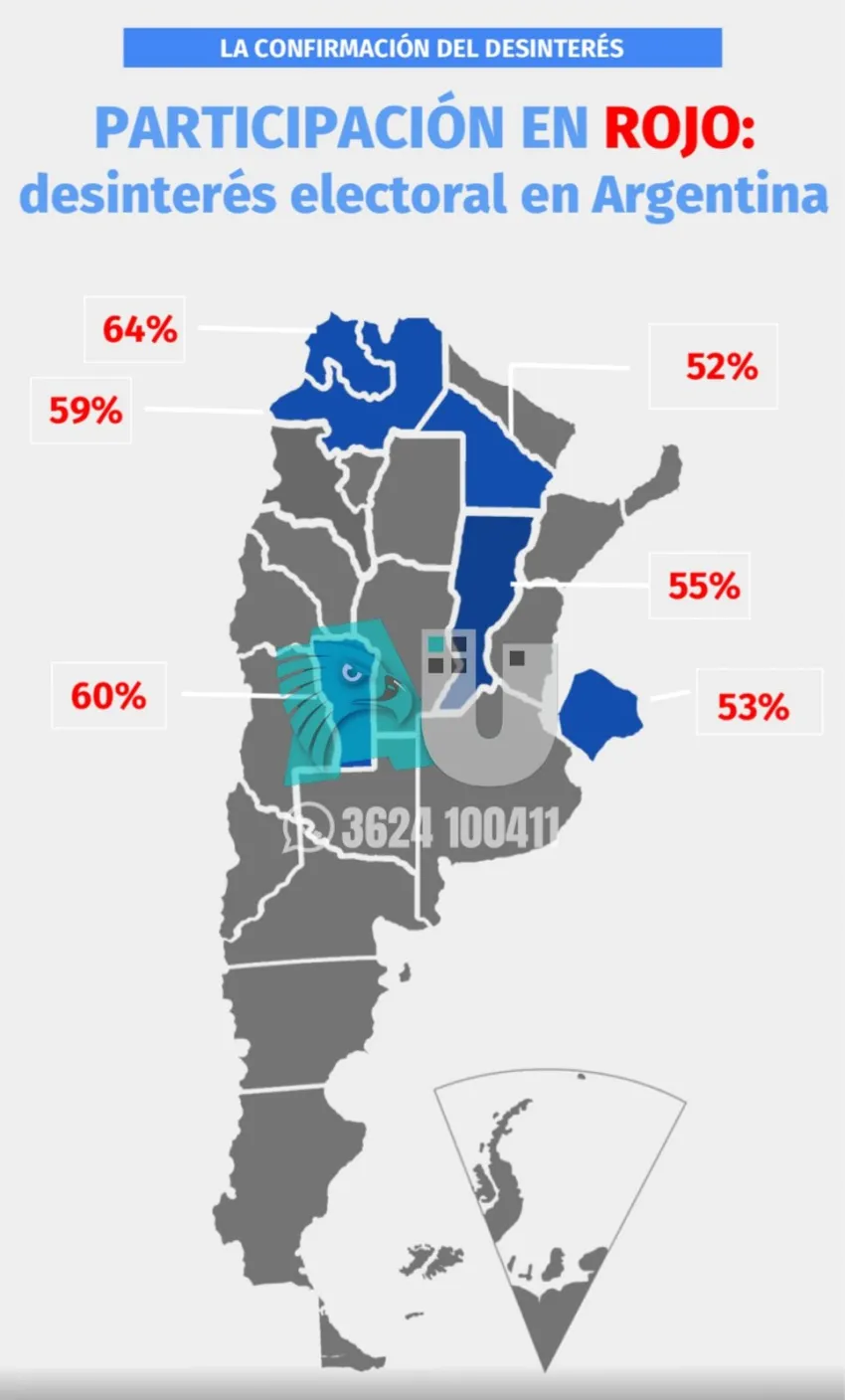 En lo que va del año Chaco es la provincia con menor porcentaje de votando, acudió el 52 por ciento del padrón, seguida por la Ciudad Autónoma con el 53 y Santa Fe con el 55 por ciento.