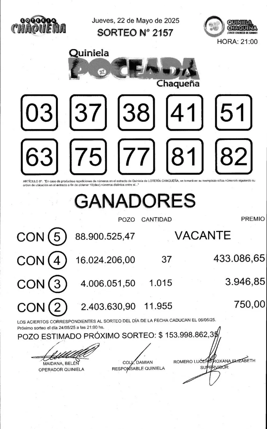 Se efectuó este jueves un nuevo sorteo de la Quiniela Poceada de Lotería Chaqueña y no hubo ganadores con los cinco aciertos.