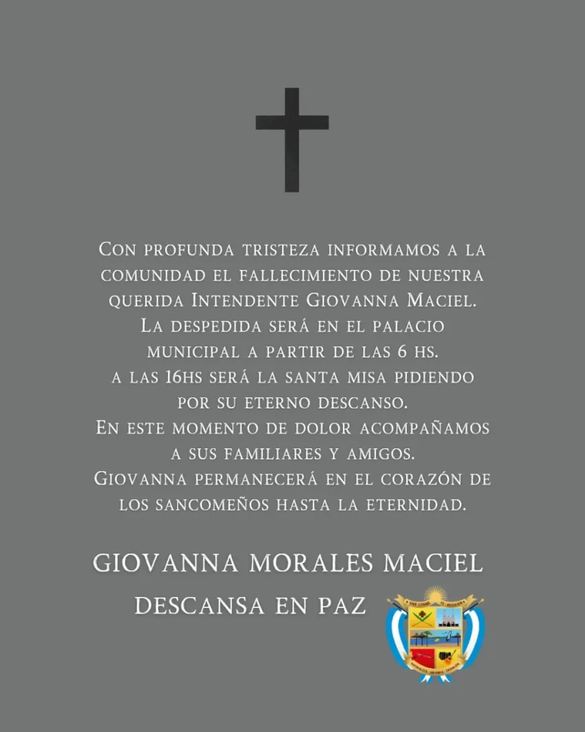 La comunidad de San Cosme se encuentra de luto tras el fallecimiento de su intendente, Giovanna Morales Maciel, quien murió en la mañana de este sábado luego de ser hospitalizada de urgencia debido a una descompensación sufrida en su domicilio.