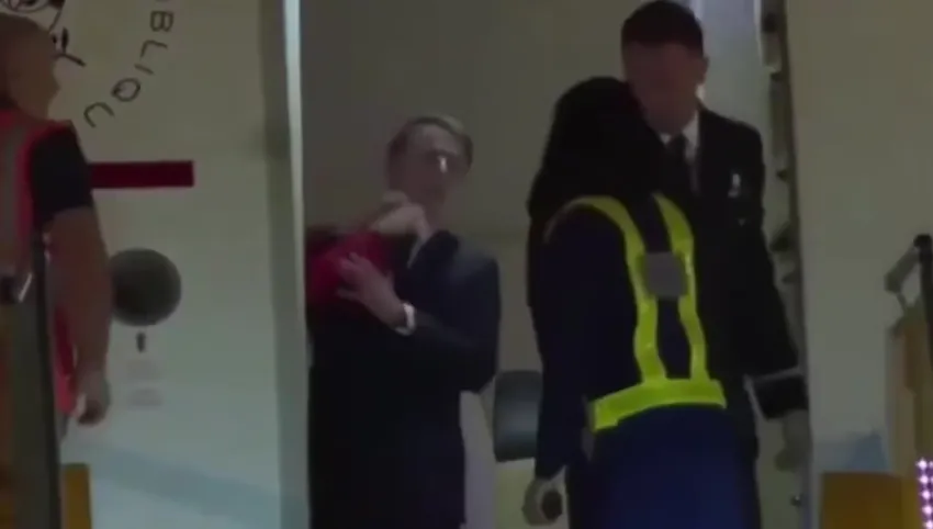 El mandatario galo se percató de que la secuencia había sido captada por los medios y alcanzó a saludar incómodamente con una sonrisa. Luego la pareja presidencial bajó del avión, aunque sin darse la mano.