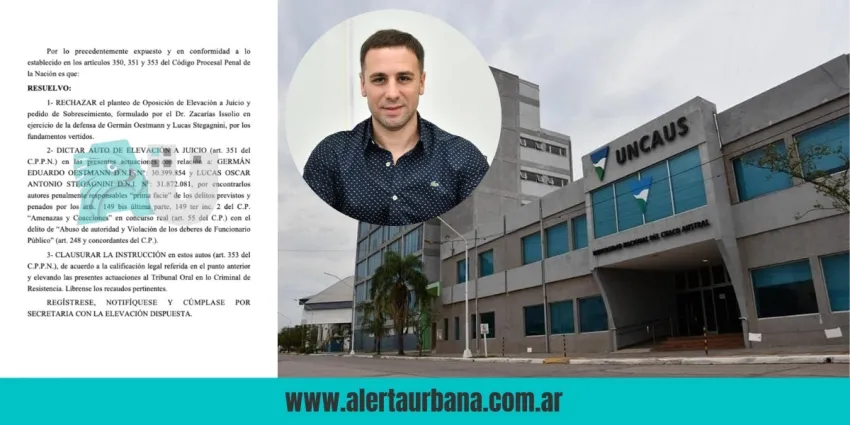 El Juzgado Federal de Presidencia Roque Sáenz Peña resolvió elevar a juicio oral la causa penal que involucra al rector de la Universidad Nacional del Chaco Austral (UNCAus), Germán Oestmann, y al secretario administrativo de la misma institución, Lucas Stegagnini. Ambos están imputados por los delitos de amenazas, coacciones, abuso de autoridad y violación de los deberes de funcionario público.