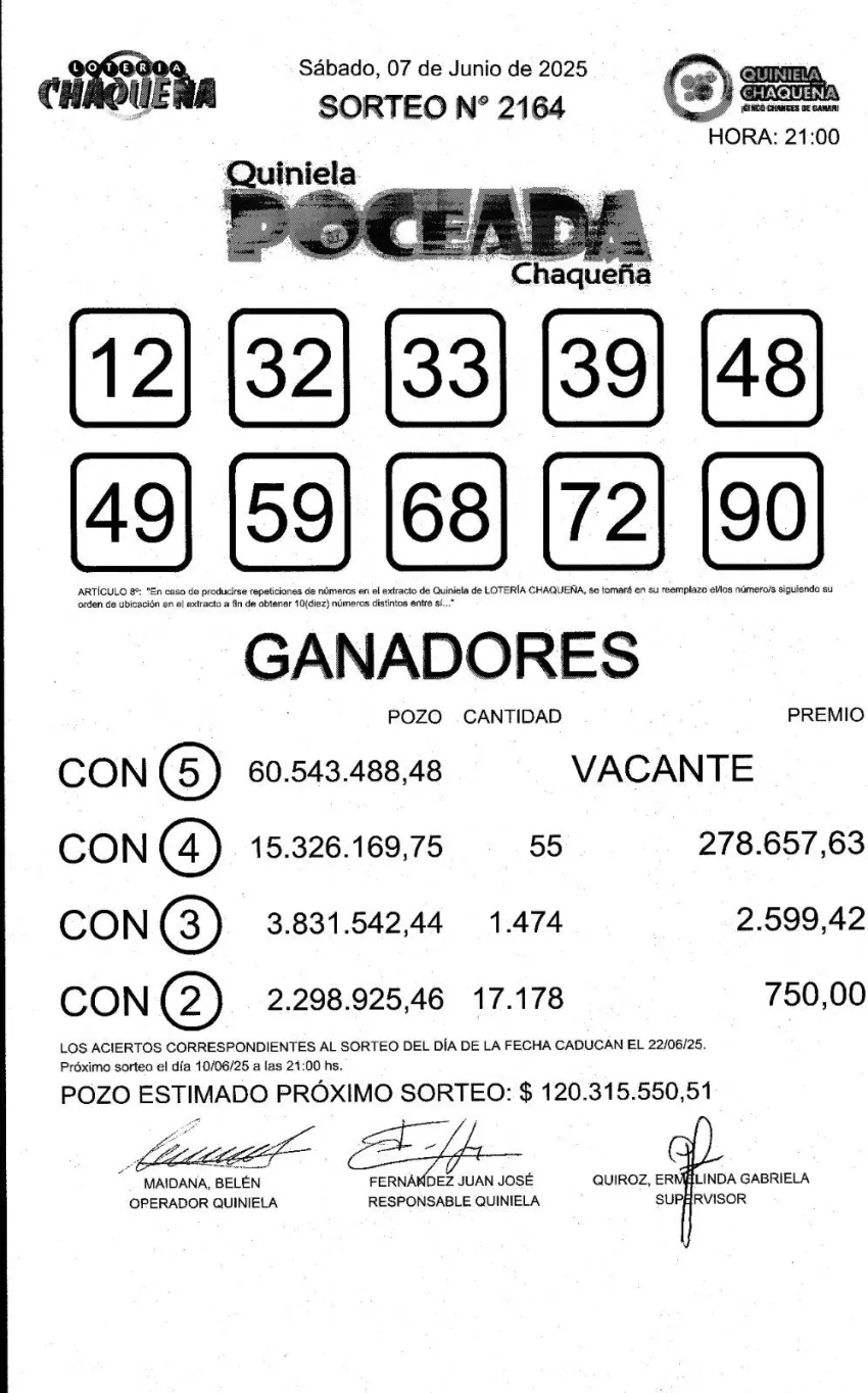 Los números sorteados fueron: 12-32-33-39-48-49-59-68-72 y 90. Con cuatro aciertos, hubo 55 ganadores que se llevarán 278.000 pesos cada uno. El próximo sábado el pozo tendrá un piso de premio de 120 millones de pesos.