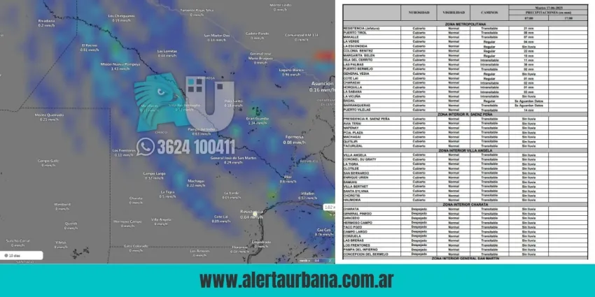 Las precipitaciones registradas hasta las 7 de este martes 17 de junio fueron moderadas en la zona metropolitana del Chaco y prácticamente nulas en buena parte del interior provincial, según el informe emitido por la Policía del Chaco.