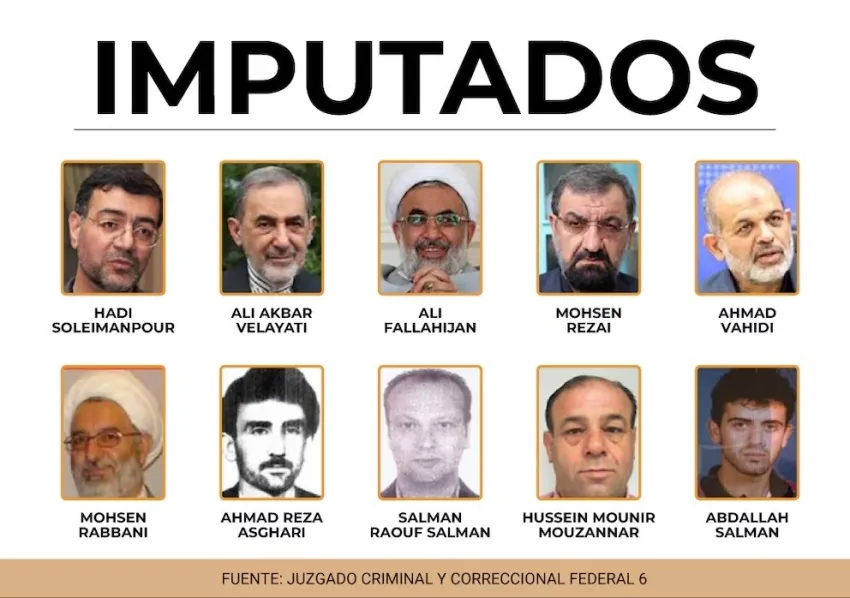 Los 10 acusados son Alí Fallahijan, Alí Akbar Velayati, Mohsen Rezai, Ahmad Vahidi, Hadi Soleimanpour, Mohsen Rabbani, Ahmad Reza Asghari, Salman Raouf Salman, Abdallah Salman y Hussein Mounir Mouzannar. Tienen alerta roja de Interpol y pedido de captura internacional desde 2006 pero nunca fueron detenidos. Irán, el país de la mayoría de los imputados, no extradita a sus ciudadanos y cuando viajan por el mundo no son detenidos por razones geopolíticas o porque las alertas no se activan. Muchos son actualmente funcionarios del gobierno de Irán y otros lo fueron cuando ocurrió el atentado.
