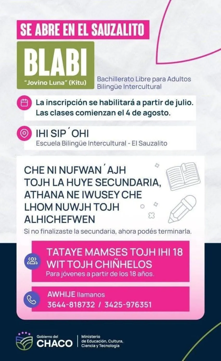 La subsecretaria Coria informó que las inscripciones se encuentran abiertas desde el 1 de julio, en esta semana, y que las clases comenzarán el 4 de agosto, por lo cual invita "tanto a jóvenes wichí como no wichí a que puedan inscribirse y así terminar su escuela secundaria".