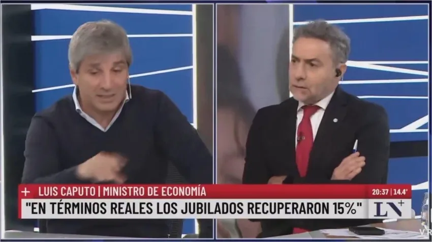 Durante una entrevista con Luis Majul en LN+, Caputo sostuvo que "los jubilados están mucho mejor en dólares" que en gestiones anteriores y remarcó que, desde diciembre, "las jubilaciones recuperaron un 15% en términos reales, en poder de compra".