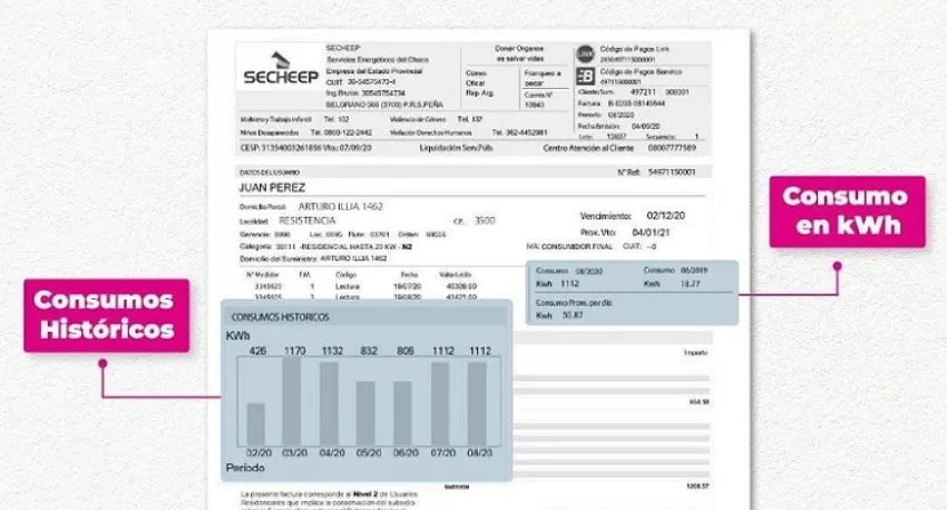 En cada factura de Secheep se pueden identificar datos claves como el consumo en kilovatios-hora (kWh), el histórico de consumo mensual y el monto final a pagar. "Lo que usás, es lo que pagás. Y si lo cuidás, lo notás", remarca uno de los mensajes de la iniciativa.