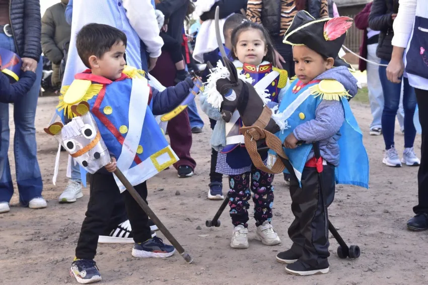 Con capas, caballitos de cartón y banderas de la libertad, niños del Centro de Desarrollo Infantil (CDI) de Fontana, junto a sus familias y docentes, realizaron una caminata simbólica para recrear el histórico Cruce de los Andes.