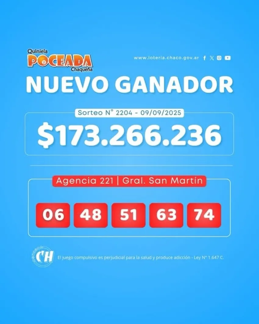Se efectuó este martes un nuevo sorteo de la Quiniela Poceada de Lotería Chaqueña y hubo un solo ganador con los cinco aciertos.