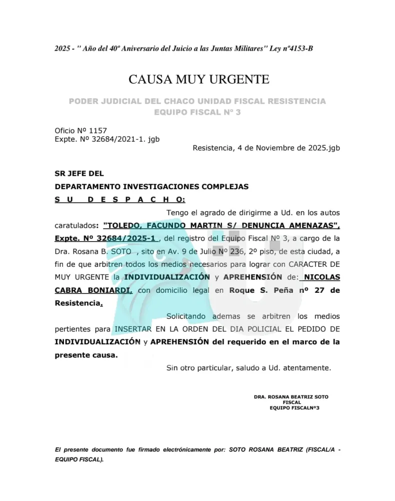 Según testigos, Boniardi Cabra se acercó durante la mañana de este martes al Instituto Médico Forense, entró y amenazó a un ingeniero que trabaja allí y quien abre los celulares. El letrado le habría dicho: "Que se cuide estos días porque él sabía lo que podía pasar".
