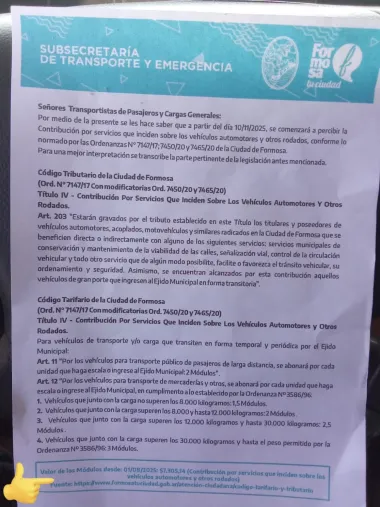 La ordenanza, impulsada por la Municipalidad que encabeza el intendente Jorge Jofré, establece el cobro de una tasa a los vehículos de carga o pasajeros que no estén radicados en Formosa capital. El cálculo se basa en una tabla de entre uno y tres módulos —cada uno de $7.305,14— según el peso del rodado.