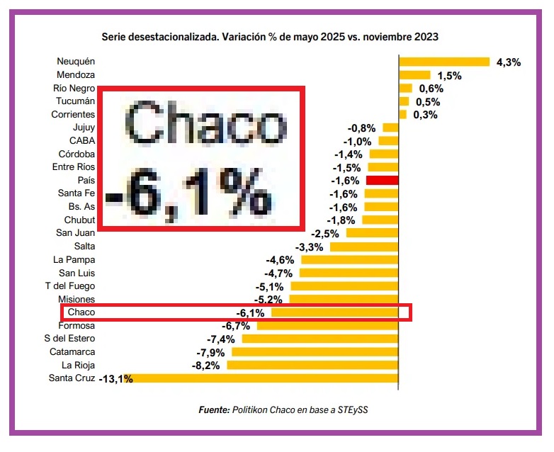 Esta crítica situación ubica a la provincia entre las cinco con peor desempeño a nivel nacional, solo superada por Santa Cruz (-13.1%), La Rioja (-8.2%), Catamarca (-7.9%) y Santiago del Estero (-7.4%).