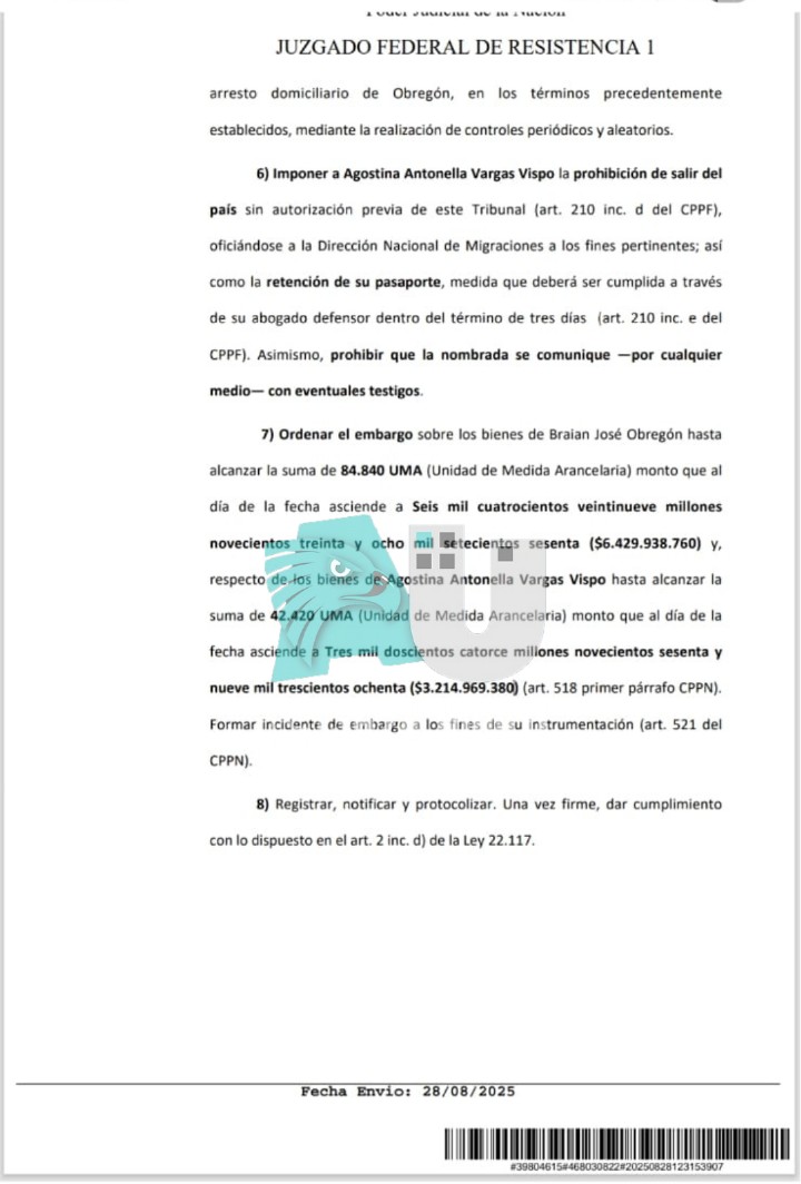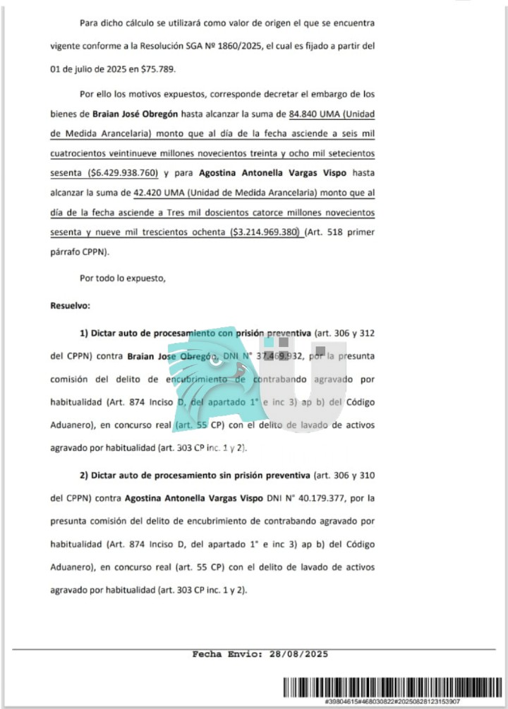 Además de las restricciones personales, la Justicia ordenó un millonario embargo sobre los bienes de ambos imputados. A Obregón se le embargó una suma de $ 6.429.938.760, mientras que a Agostina Vargas Vispo se le embargó un total de $ 3.214.969.380. La resolución judicial se fundamenta en la presunta comisión de los delitos de encubrimiento de contrabando agravado y lavado de activos agravado.