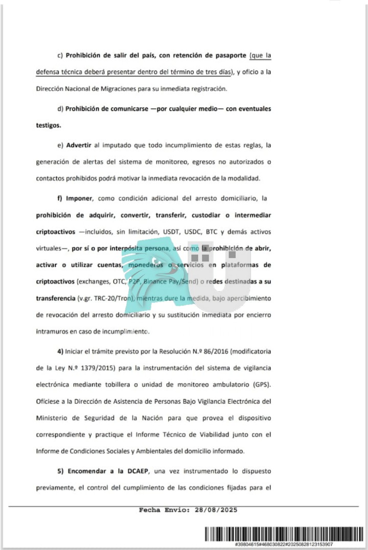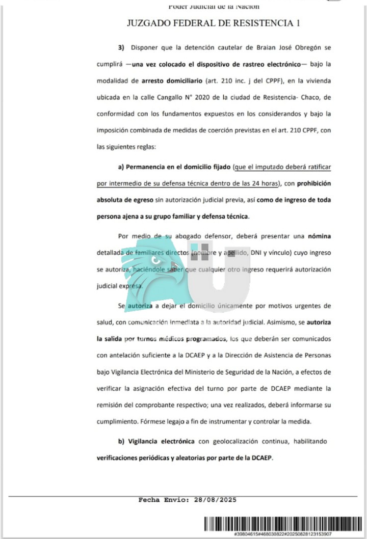 Según el documento judicial, Braián Obregón deberá permanecer en su domicilio de la calle Cangallo con prohibición absoluta de egreso, salvo por motivos de salud urgentes o turnos médicos programados. Se le ha impuesto una vigilancia electrónica continua a través de una tobillera o monitoreo ambulatorio (GPS).