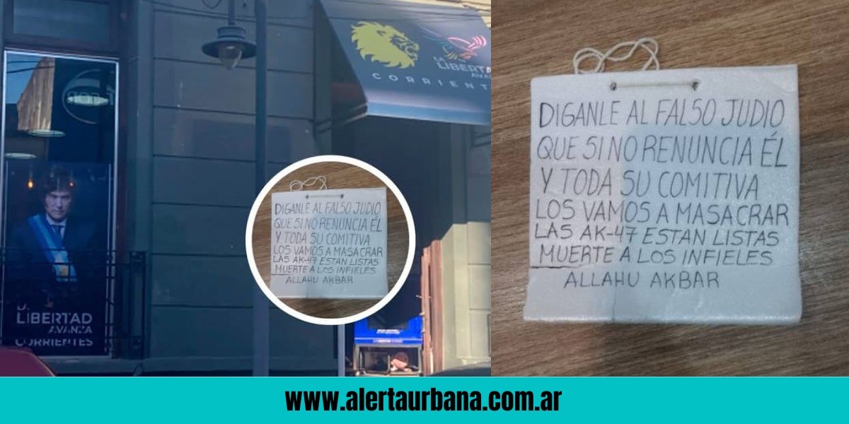 Por medio de una denuncia radicada ante el Ministerio Público Fiscal, dirigentes de La Libertad Avanza en Corrientes detallaron el hallazgo de un mensaje intimidatorio. "Díganle al falso judío que si no renuncia él y toda su comitiva, los vamos a masacrar". Vale recordar que se tiene prevista la visita del presidente Javier Milei a Corrientes antes de las elecciones del 26 de octubre.