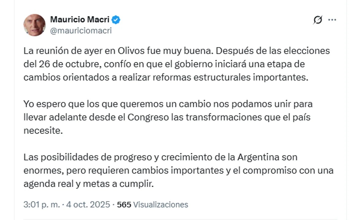 "La reunión de ayer en Olivos fue muy buena. Después de las elecciones del 26 de octubre, confío en que el gobierno iniciará una etapa de cambios orientados a realizar reformas estructurales importantes", afirmó Macri, confirmando la sintonía del encuentro.