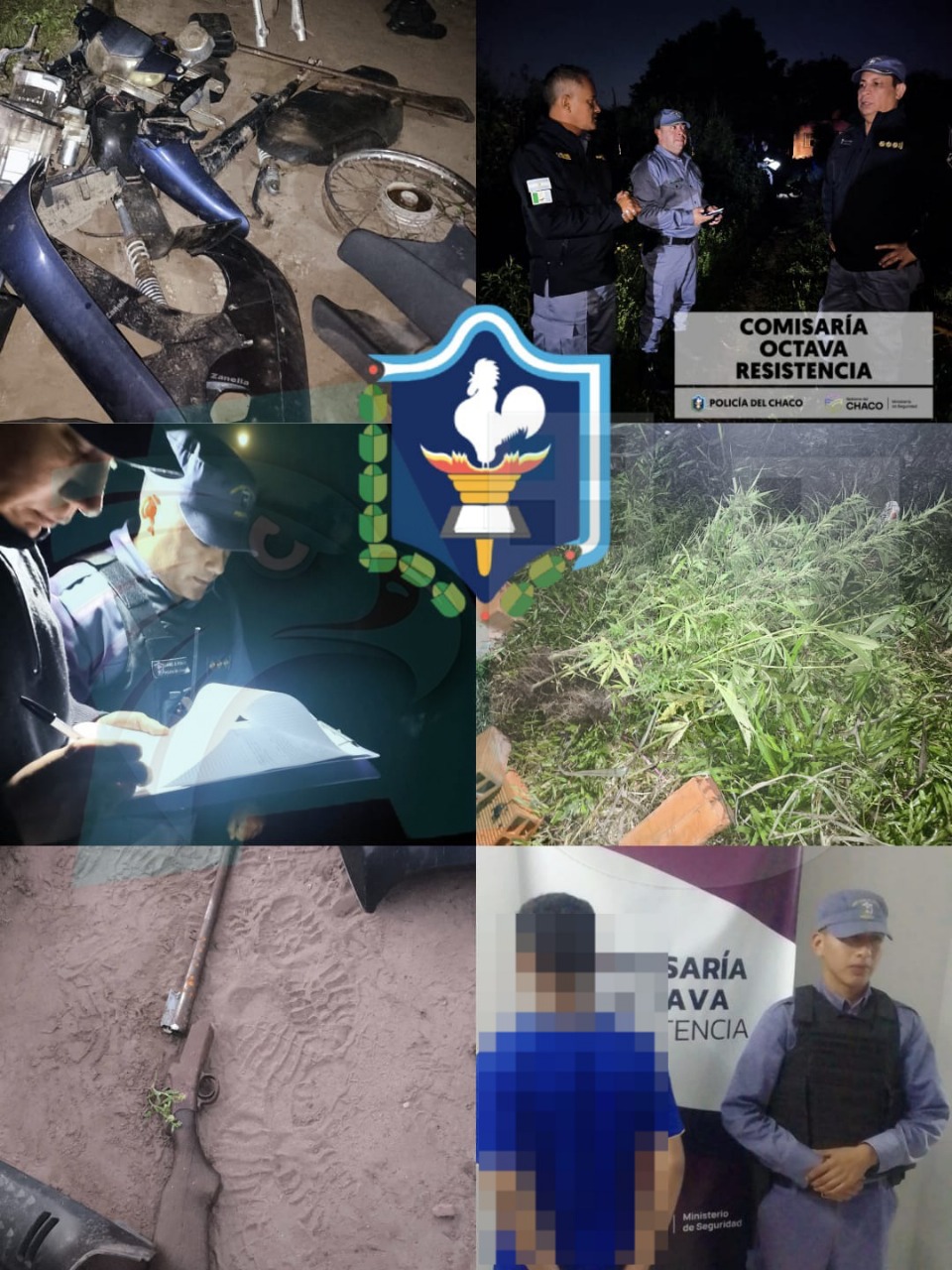 Durante el registro del lugar, las autoridades realizaron importantes secuestros: una escopeta calibre 16, dos motocicletas (una de ellas con pedido de secuestro por robo), varias motopartes y una bicicleta de alta gama. Además, la intervención reveló un delito contra la salud pública: se hallaron siete plantas de marihuana ocultas en el fondo del predio.