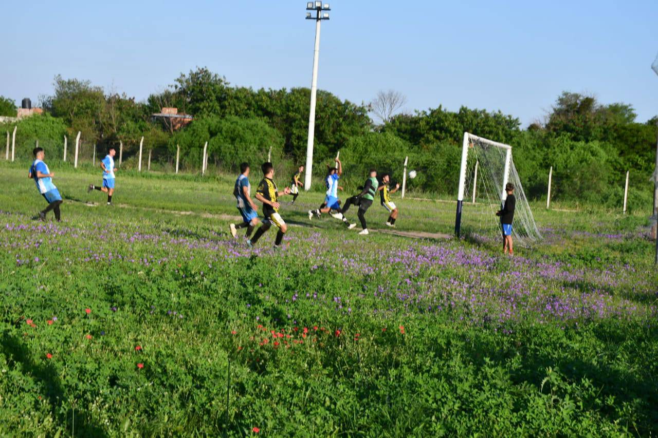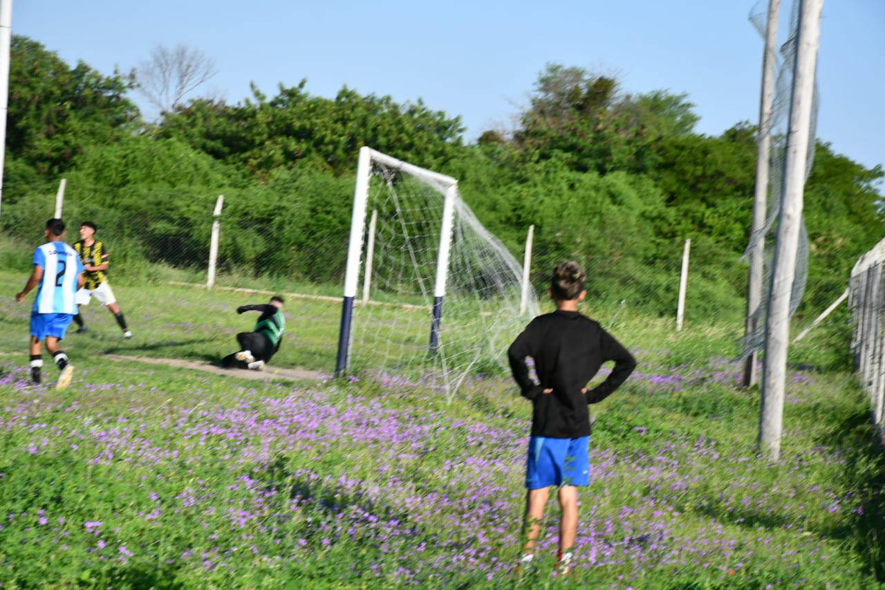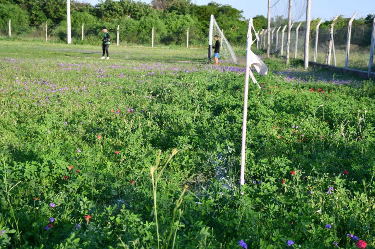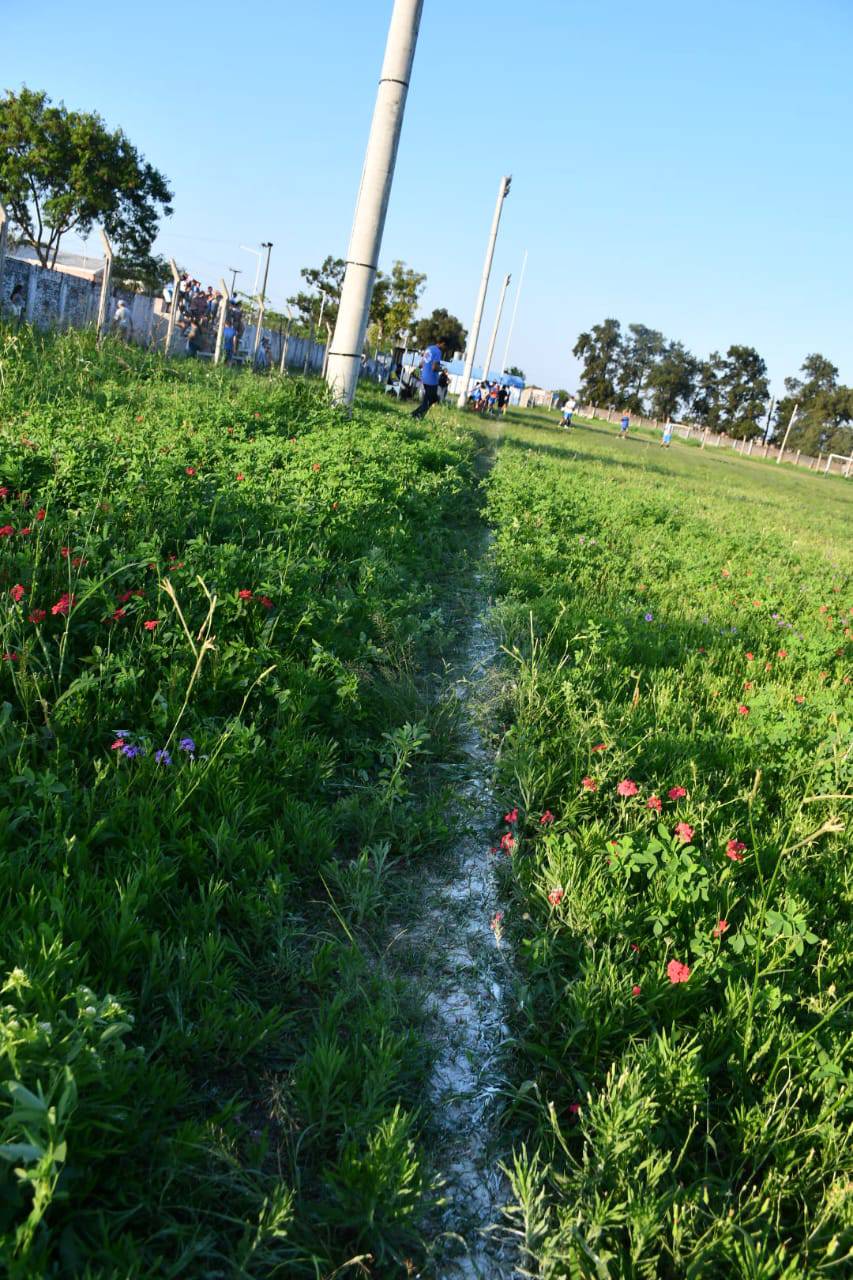 Y no era para menos: en las imágenes pueden verse flores, el pasto altísimo en algunos sectores de la cancha y hasta teros entre las piernas de los futbolistas.