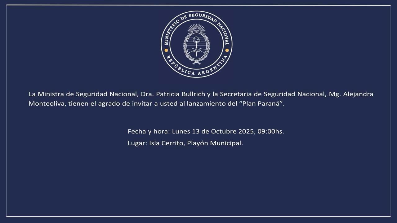 Desde el Ministerio de Seguridad de la Nación, informaron que este lunes 13, a las 9, la titular de la cartera, la Mg. Alejandra Monteoliva visitará La Isla del Cerrito de nuestra provincia para encabezar el lanzamiento del "Plan Paraná".