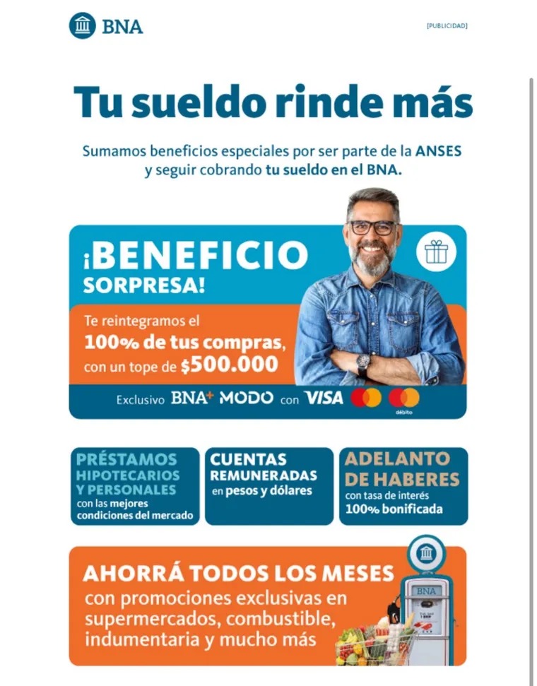 Según se detalla en la comunicación oficial del BNA, para acceder al “Beneficio Sorpresa” los empleados de Anses deberán cumplir dos condiciones fundamentales: percibir su sueldo en una cuenta del Banco Nación y realizar sus compras a través de la aplicación BNA+ MODO utilizando las tarjetas de débito o crédito Visa asociadas.