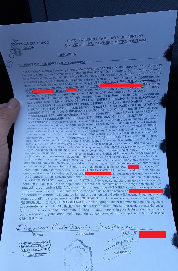 La Policía del Chaco busca a Valentina Luz Barreiro, de 18 años, desaparecida en Resistencia. Su abuelo y tutor, Carlos Barreiro, la vio por última vez en la Universidad Popular el lunes 13 de octubre alrededor de las 18. La joven, estudiante de Enfermería, no regresó a su hogar a la hora habitual (21.30) y su teléfono se encuentra apagado.