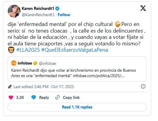 “Dije ‘enfermedad mental’ por el chip cultural. Pero en serio: si no tenés cloacas, la calle es de los delincuentes, ni hablar de la educación, y cuando vayas a votar fíjate si el aula tiene picaportes, ¿vas a seguir votando lo mismo?”, preguntó Reichardt desde sus redes sociales.