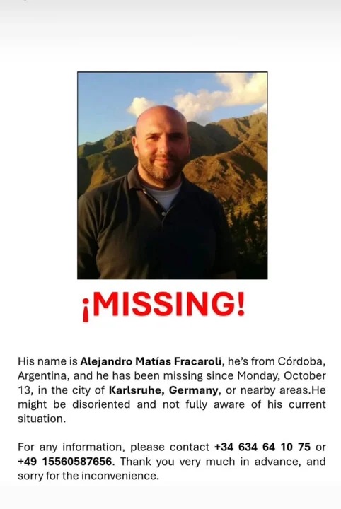 Se trata de Alejandro Matías Fracaroli, de 44 años. Fue visto por última vezal salir de su trabajo en Karlsruhe.