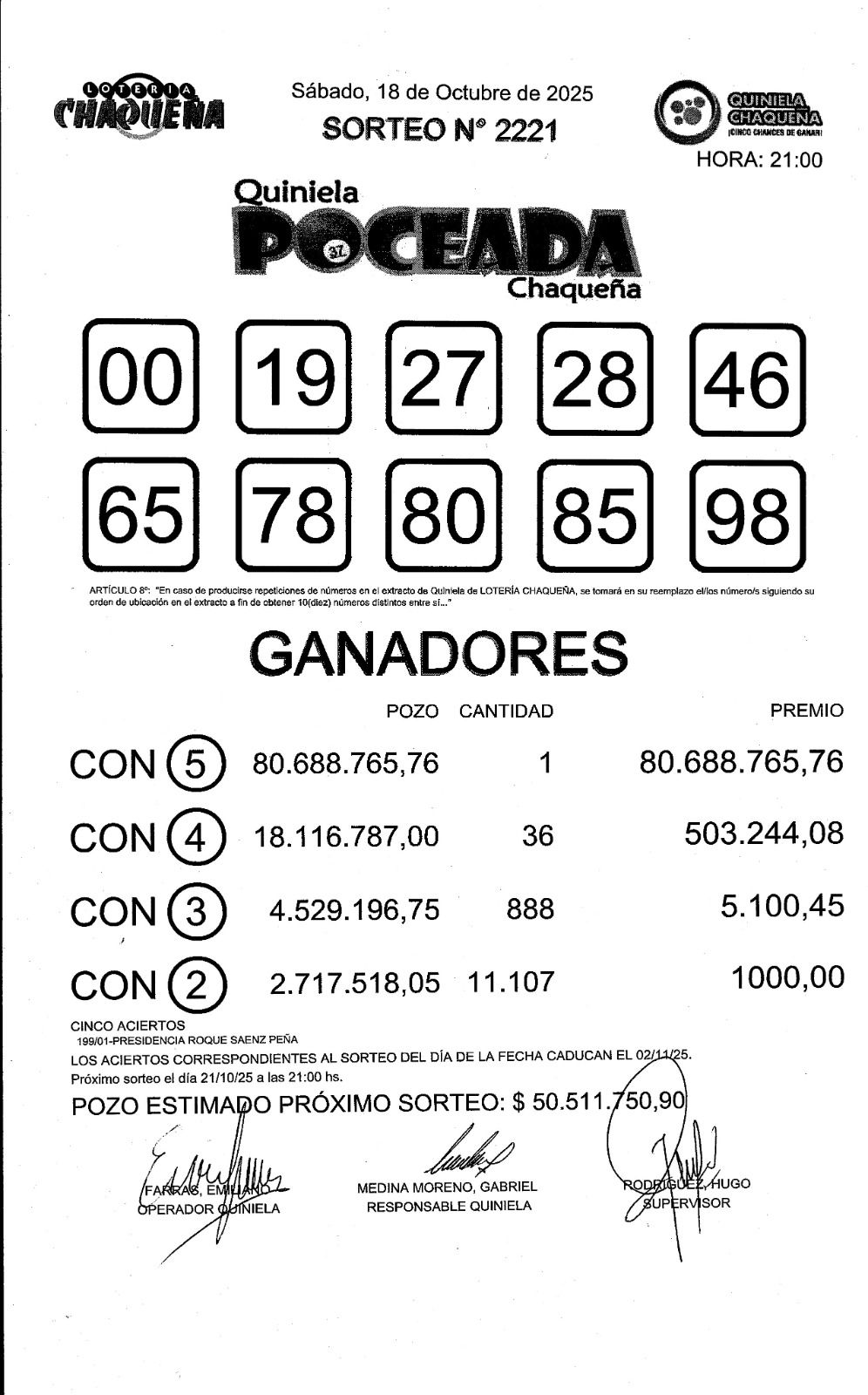 Los números sorteados fueron: 00-19-27-28-46-65-78-80-85 y 98. La combinación ganadora fue 19-27-46-65 y 78, se jugó en la Agencia 199 de Sáenz Peña y el poseedor recibirá $ 80 millones. El próximo martes el pozo tendrá un piso de premio de 50 millones de pesos.