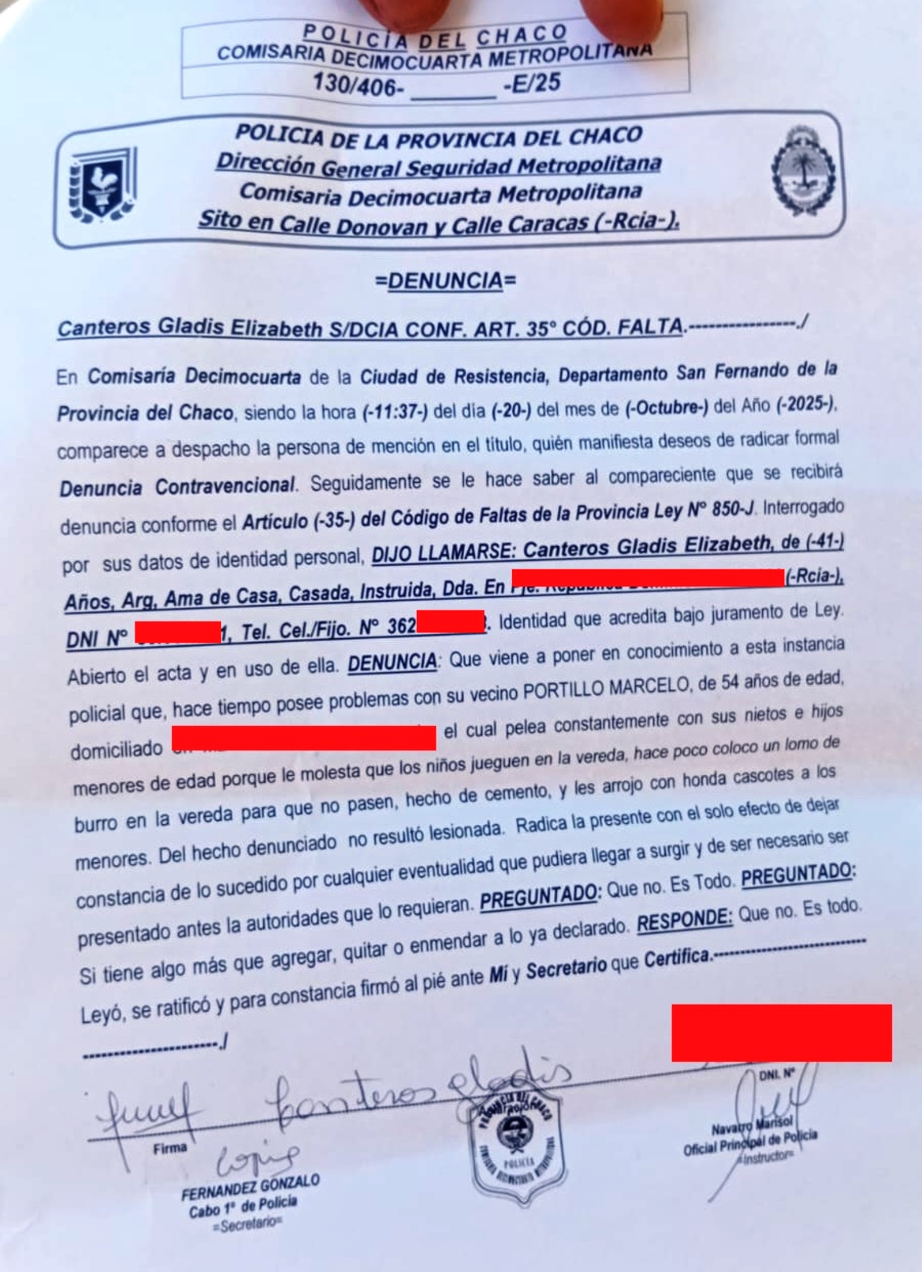 En su declaración policial del 20 de octubre, Canteros detalló que Portillo pelea constantemente con sus hijos menores y nietos. La situación escaló hasta que el vecino colocó un “lomo de burro” de cemento en la vereda para impedir el paso de los niños y, de acuerdo con la denuncia, les ha arrojado cascotes con una honda. Afortunadamente, ninguno de los menores resultó lesionado.