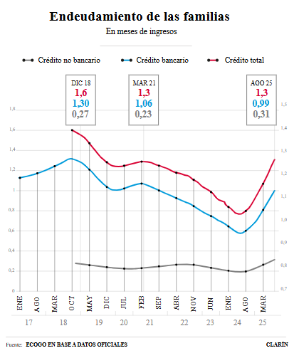 Con datos hasta agosto, EcoGo observó que ese mes hubo un aumento de 4,1% real (es decir, por encima de la inflación) de lo que se llama proveedores no financieros de crédito, que pueden ser desde cooperativas hasta cadenas de supermercados que ofrecen tarjetas a sus clientes o entidades que dan préstamos para consumo en cuotas. En el último año creció 77% el financiamiento de las familias por esta vía.