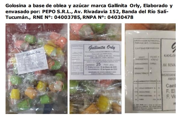 Paralelamente, también fue prohibida la golosina "Gallinita Orly", tras detectarse que los números de registro en su etiqueta eran inexistentes. El INAL concluyó que el producto carecía de registros sanitarios válidos y utilizaba información falsa, lo que impedía verificar su origen y control de calidad.