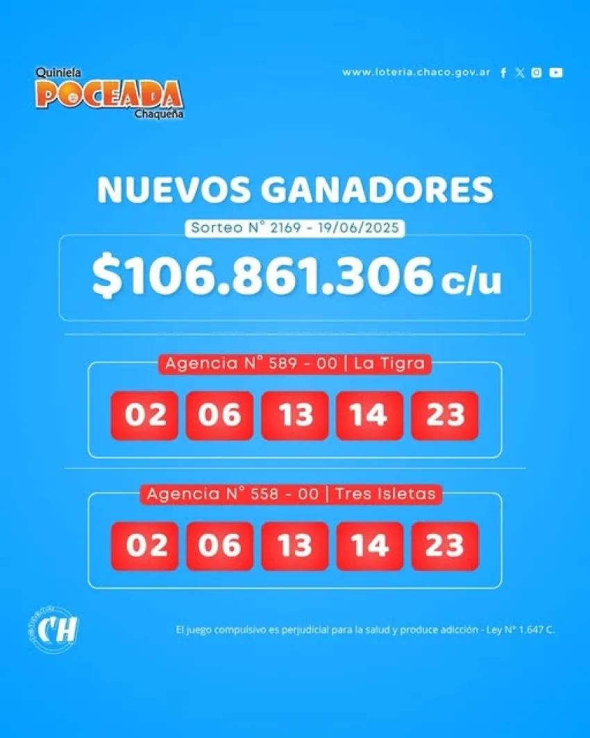 El apostador de La Tigra acertó los números 02-06-13-14-23 mientras que el de Tres Isletas hizo lo propio con idéntica combinación.
