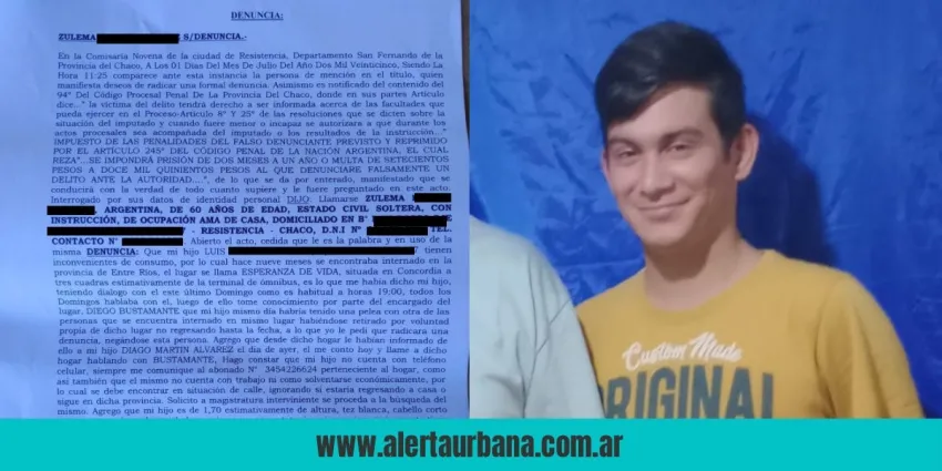 Una grave denuncia por desaparición fue radicada en la Comisaría Novena de Resistencia por Zulema Esther Álvarez, madre de Luis Azas quien se encontraba internado por consumos problemáticos en una comunidad terapéutica en Concordia, Entre Ríos, y se desconoce su paradero desde el domingo.