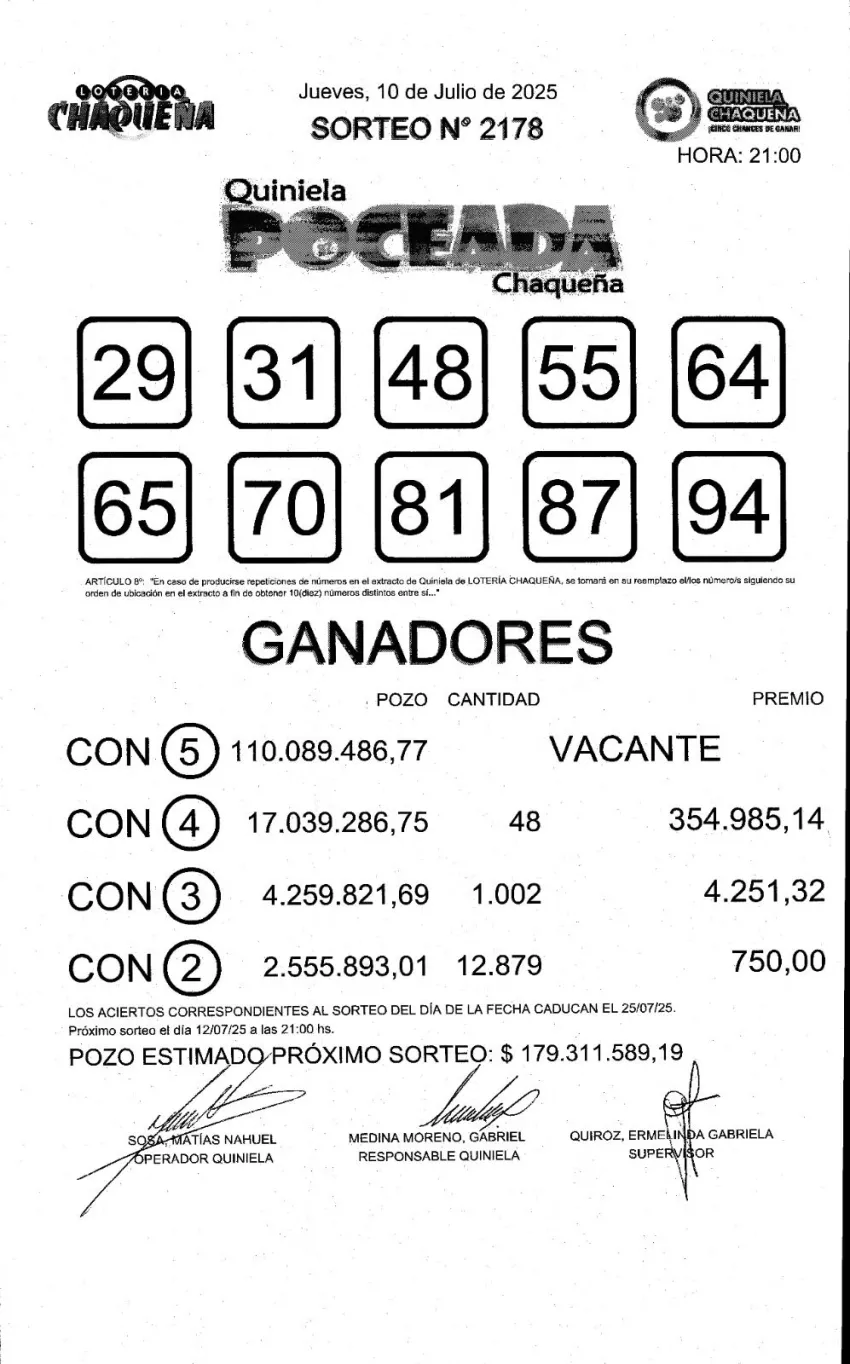 Los números sorteados fueron: 29-31-48-55-64-65-70-81-87 y 94 Con cuatro aciertos, hubo 48 ganadores que se llevarán 354.000 pesos cada uno. El próximo sábado el pozo tendrá un piso de premio de 179 millones de pesos.