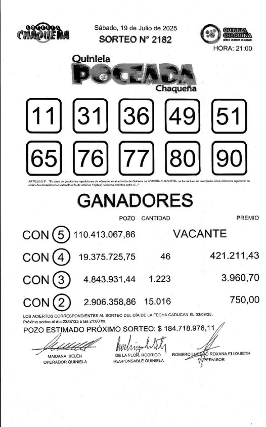 Los números sorteados fueron: 11-31-36-49-51-65-76-77-80 y 90. Con cuatro aciertos, hubo 46 ganadores que se llevarán 421.000 pesos cada uno. El próximo martes el pozo tendrá un piso de premio de 184 millones de pesos.