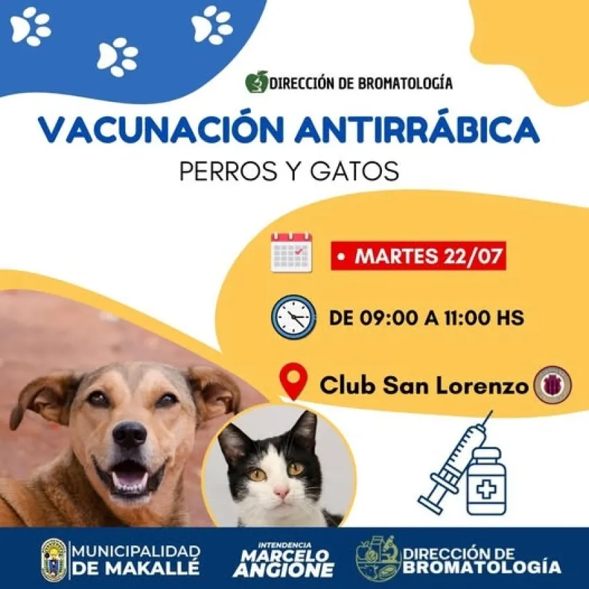 El municipio de Makallé invita a los vecinos a participar de una jornada gratuita de vacunación antirrábica para perros y gatos, que se llevará adelante este martes 22 de julio en el Club San Lorenzo, en horario de 9 a 11.