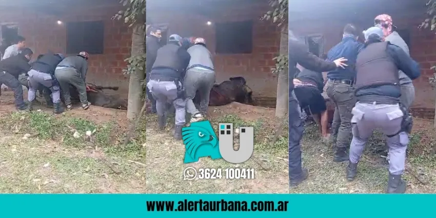 Inmediatamente, personal de la comisaría 1° de Barranqueras acudió al lugar. Al ver la complejidad de la situación, solicitaron la intervención de Bomberos de la Policía. Así cuatro valientes uniformados de la fuerza y los propios vecinos, trabajaron en equipo para sacar al animal de la peligrosa trampa.