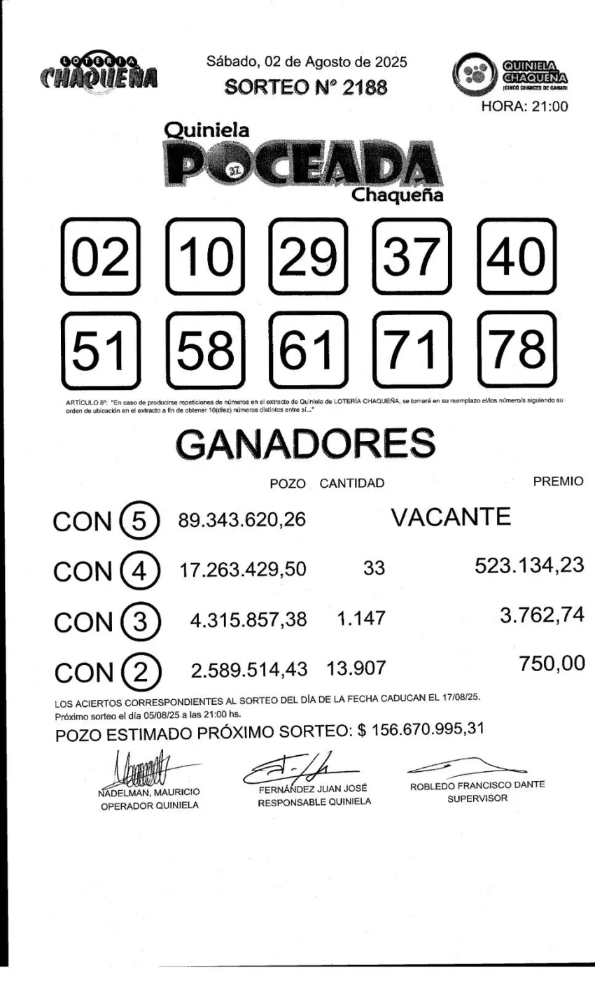 Los números sorteados fueron: 02-10-29-37-40-51-58-61-71 y 78. Con cuatro aciertos, hubo 33 ganadores que se llevarán 523.000 pesos cada uno. El próximo sábado el pozo tendrá un piso de premio de 156 millones de pesos.